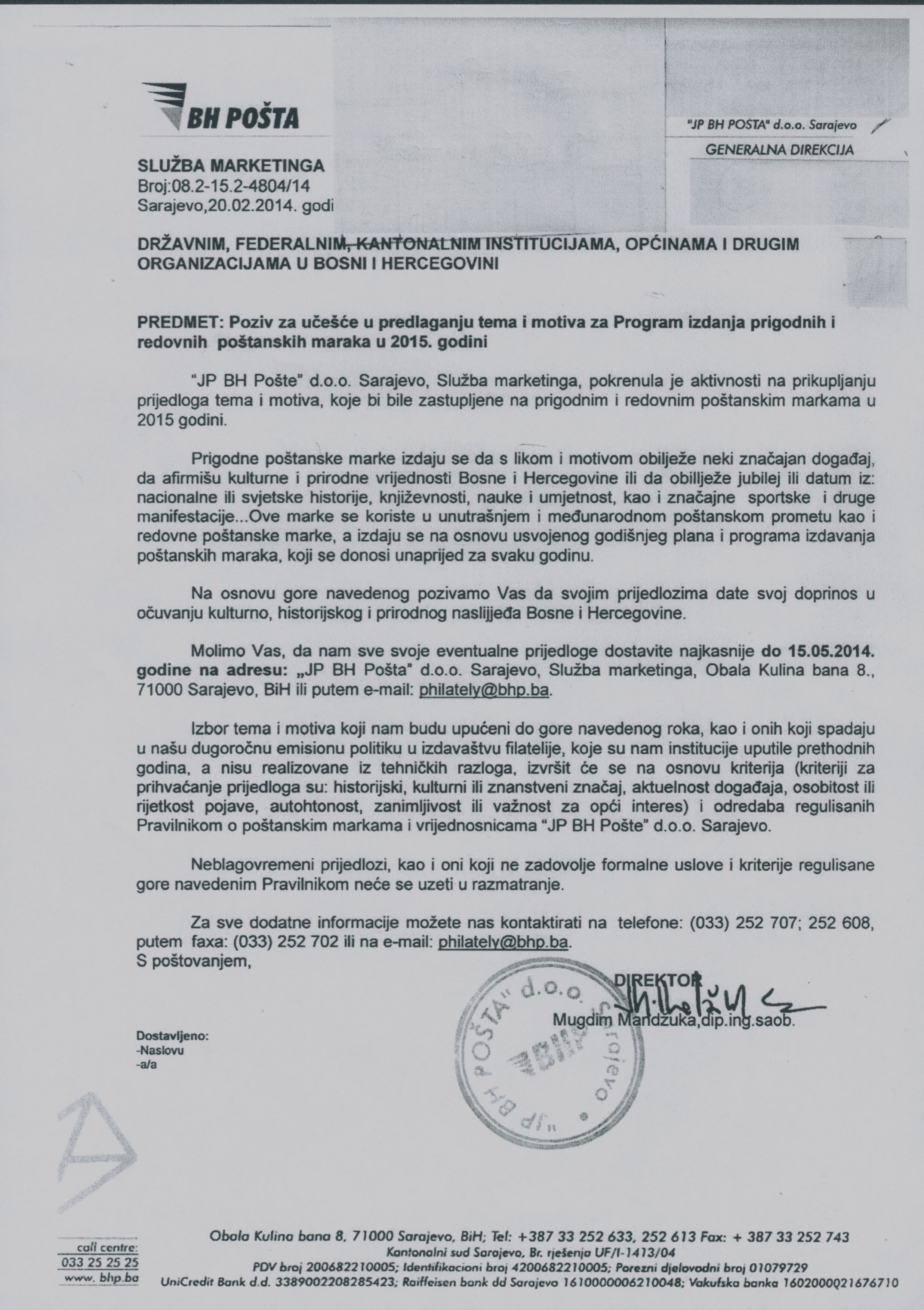 Poziv za učešće u predlaganju tema i motiva za Program izdanja prigodnih i redovnih poštanskih maraka u 2015. godini