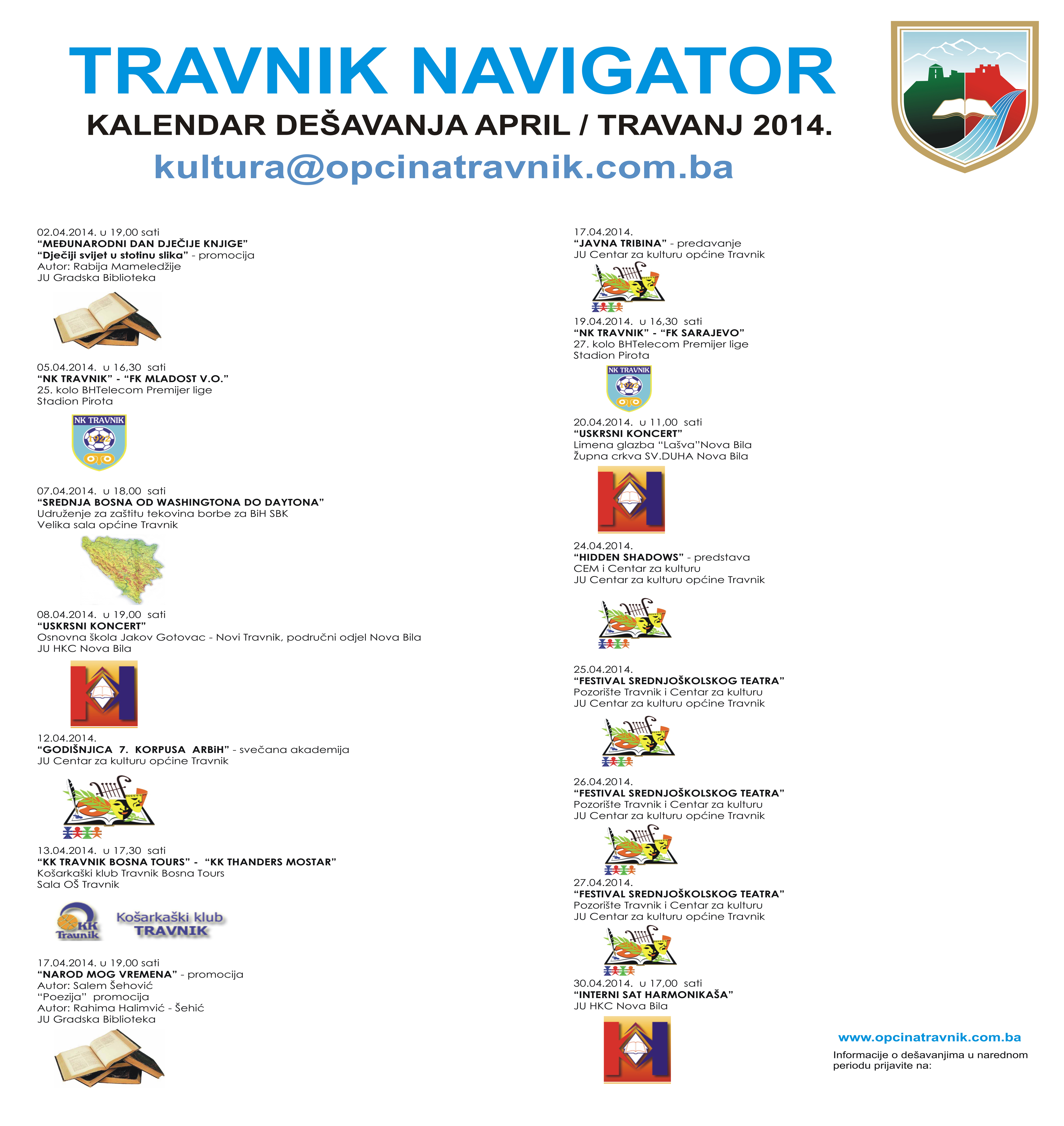 Travnik navigator je nova usluga koja nudi informacije o kulturnim I društvenim događajima za svaki naredni mjesec.Stoga pozivamo sve zainteresirane organizatore dešavanja na području općine Travnik da svoje aktivnosti prijave na email: