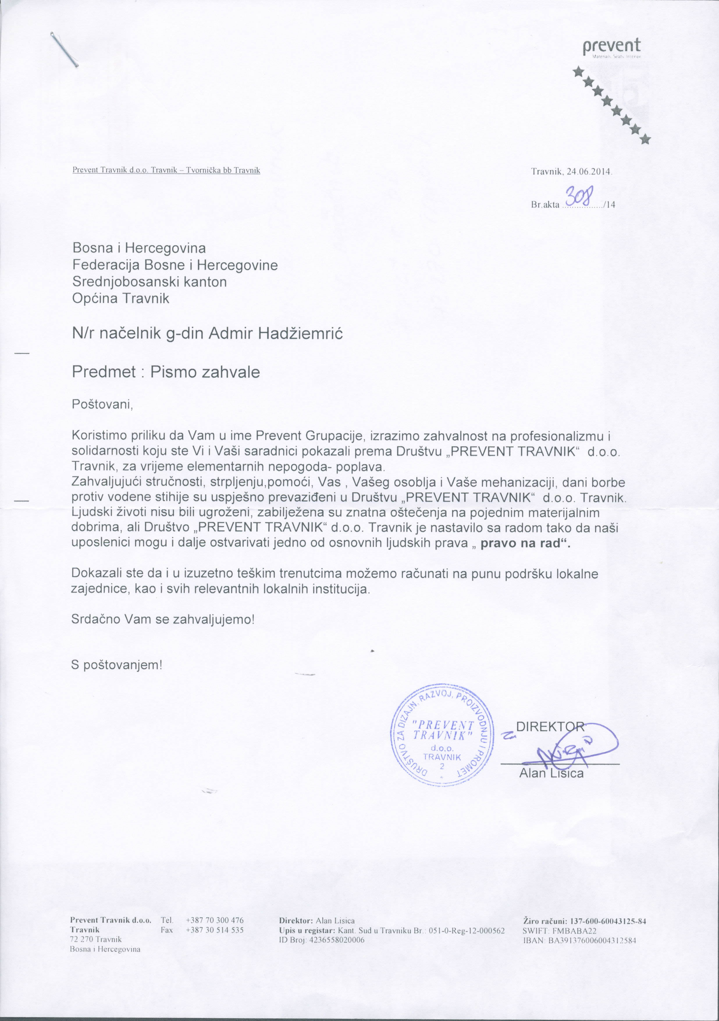 Načelniku općine Travnik pismom zahvale obratila se Prevent grupacija koja je na taj način izrazila svoju zahvalnost zbog pružene pomoći prilikom provođenja mjera zaštite od poplava.