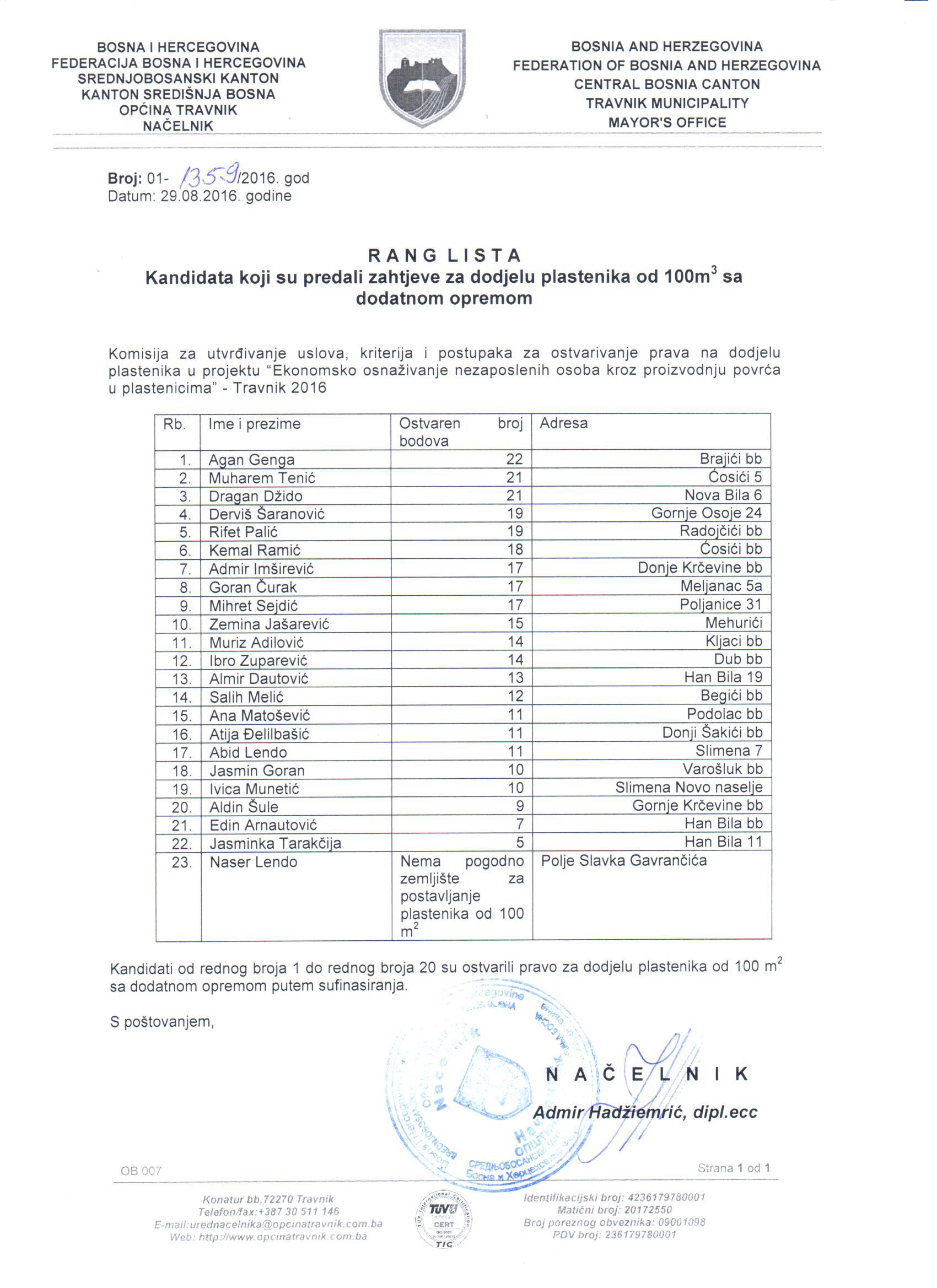 Rang lista kandidata koji su predali zahtjeve za dodjelu plastenika