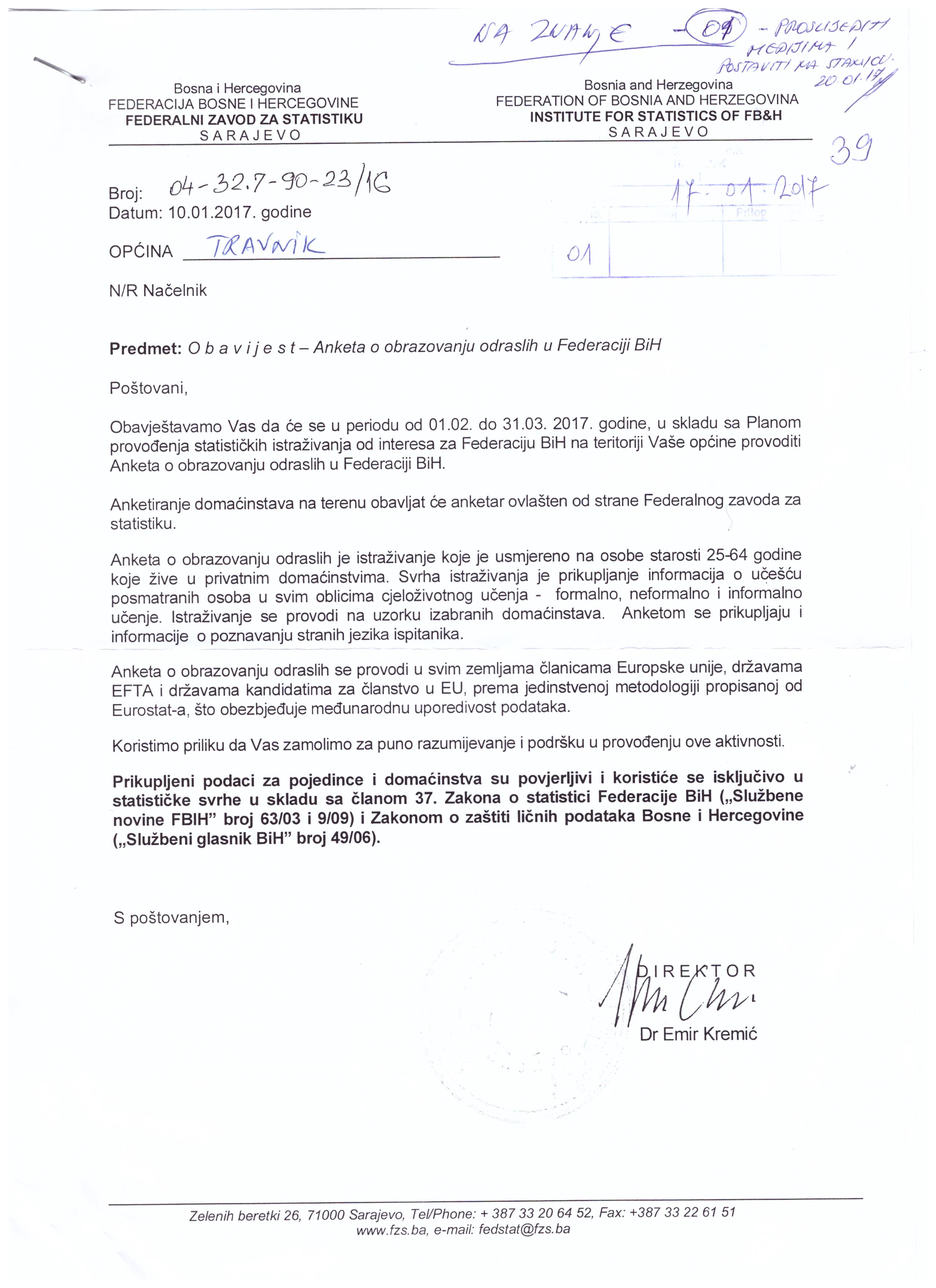 Obavijest - Anketa o obrazovanju odraslih u Federaciji BiH