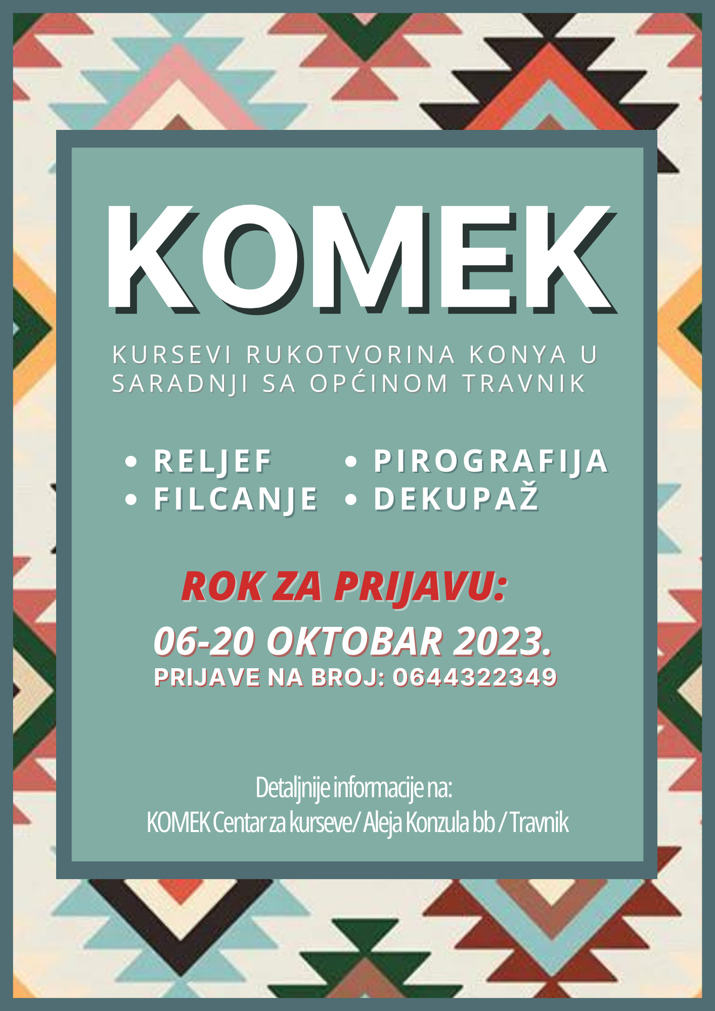 Općina Travnik u saradnji sa bratimljenom općinom Konya, nastavlja sa besplatnim kursom izrade rukotvorina. Kursevi filcanja, pirografije, reljefa i dekupaža i ove godine će se održavati u prostorijama preko puta tržnog centra "Bingo" na adresi Aleja Konzula bb.