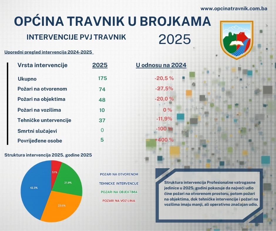 Profesionalna vatrogasna jedinica (PVJ) Travnik, koja djeluje u okviru Službe za civilnu zaštitu Općine Travnik, tokom 2025. godine realizirala je ukupno 175 intervencija, od čega su dvije evidentirane kao lažne dojave. U odnosu na 2024. godinu, kada je zabilježeno 220 intervencija, ostvaren je pad ukupnog broja intervencija od oko 20,5 posto.